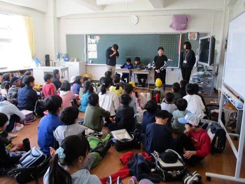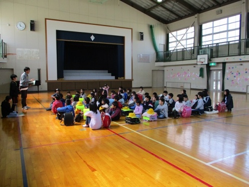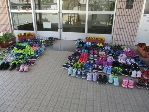 今朝の登校時には、どの通学班でも1年生の歩くペースに合わせたり、手をつないだりと、1年生を気遣う高学年の子どもたちの姿が見られました。今日は3限目に、16の地区に別れて町別子ども会を開きました。始まる前には、班長が1年生を教室まで迎えに行ってくれました。しっかり1年生のフォローをしてくれています。町別子ども会では、集合場所や集合時刻、登下校の約束などを、1年生を交えて話し合いました。体育館の入り口に置かれた子どもたちの靴が整然と並んでいたのが印象的でした。