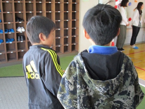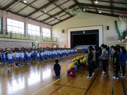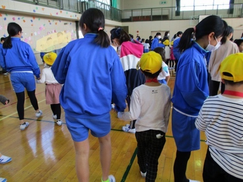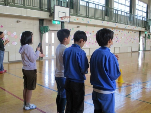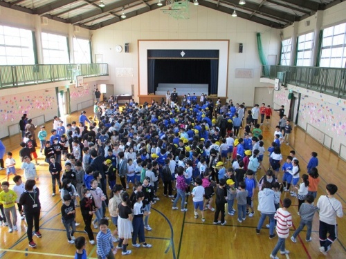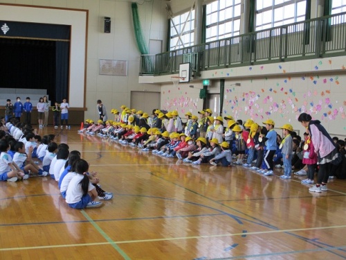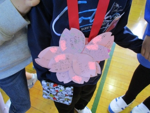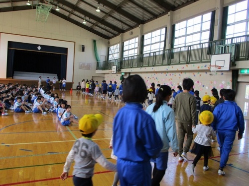 2限目、1年生を迎える会がありました。みんなの拍手の中、6年生と手をつないだ1年生が入場しました。はじめに児童会役員の挨拶がありました。今年度児童会役員になった6人が準備や進行をしてくれました。挨拶をしたり校歌を歌ったりした後、全校でジャンケンゲームをして楽しみました。1年生がジャンケンに勝つと桜の花びらのメッセージカードがもらえます。1年生の子どもたちは、花びらをいっぱいもらってとても嬉しそうでした。1年生の子どもたちにやさしく寄り添う6年生の頼もしい姿も印象的でした。