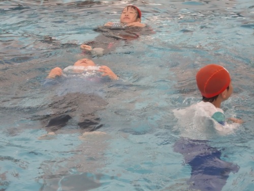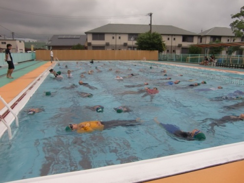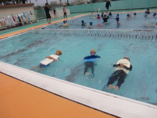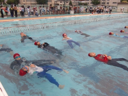 今日は、全学年が着衣水泳を行いました。水難事故から自分の命を自分で守る方法を身に付けることも大事な水泳の学習です。水の事故は、海、川、湖などで着衣のまま発生することが多いです。万が一の場合、どのように対応したらよいのかを、実際に着衣のままで水に入り学びます。子どもたちは、服を着たまま水に浮く練習、服を浮き袋にしたてて浮く練習、ペットボトルを浮力に浮く練習などをしました。