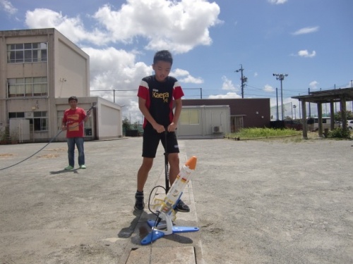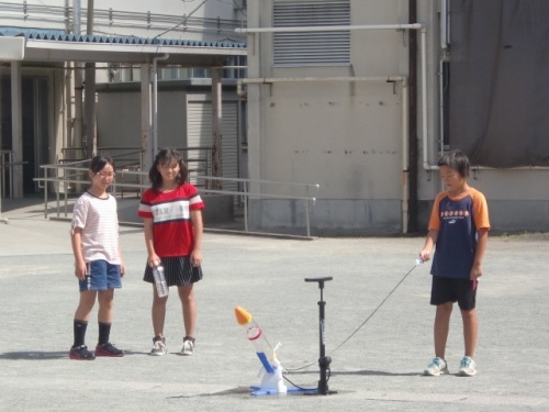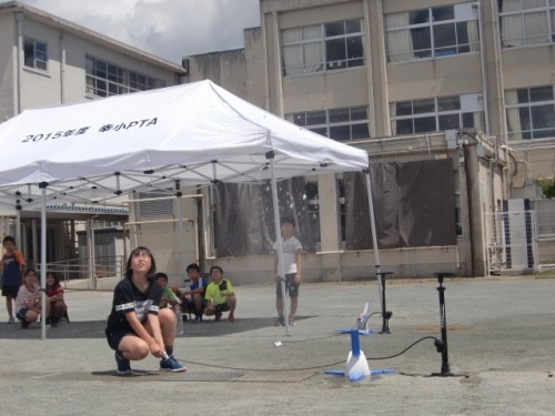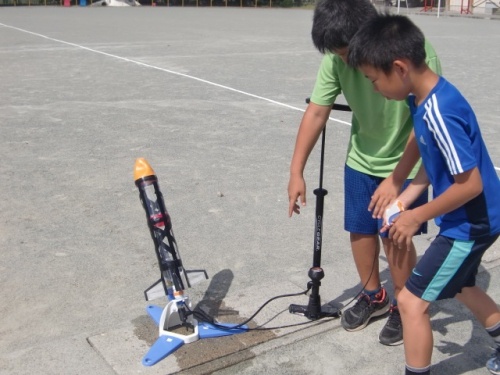 理科クラブの子どもたちが集まり、ペットボトルロケットを飛ばしました。それぞれが水量や空気圧などを調整しながら何回も飛ばしてみました。