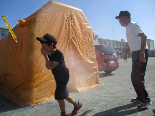 今日は、幸地区の防災訓練が行われました。避難場所である本校体育館に110人ほどの地区の方々が集まってこられました。煙体験やAEDを使った心肺蘇生講習、エコノミー症候群予防の体操などに皆さん熱心に取り組んでみえました。下水道に直結するマンホールトイレについても説明を受けました。