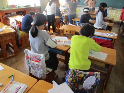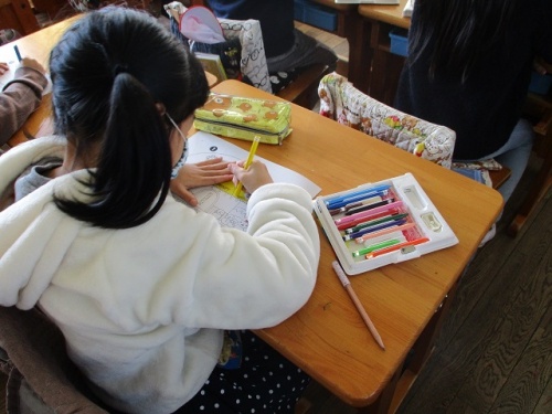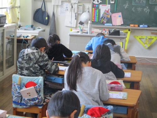 今日は今年度最後の土曜授業日です。2年生の3クラスの様子を紹介します。1組は漢字の練習をしていました。筆順をみなで確かめたり、なぞり書きをしたりしていました。一生懸命丁寧に漢字を書いていました。2組はカレンダー製作、3組は鬼のお面作りをしていました。3組では、子どもたちが、自分の作った鬼のお面と家を楽しそうに見せに来てくれました。