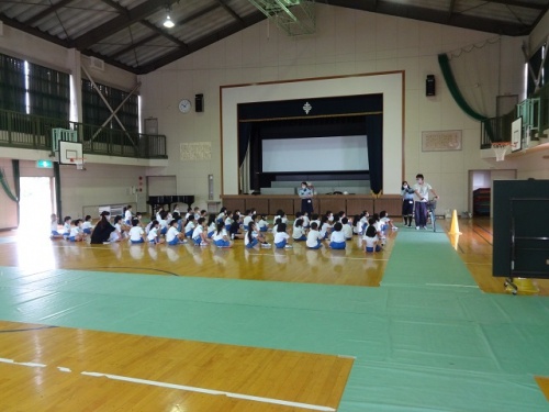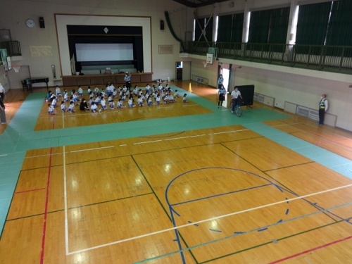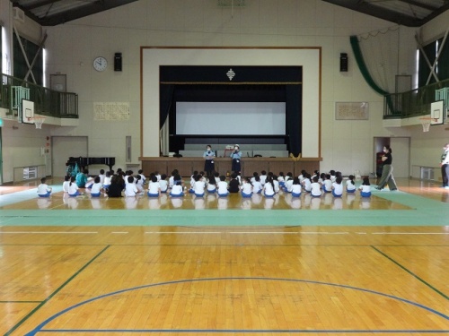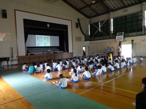 今日の2限目、とまとーずの方4人と警察から生活安全課の方1人にお越しいただいて、2年生の交通安全教室を行いました。天気の関係で体育館で行うことになりましたが、3密を避けて取り組みました。