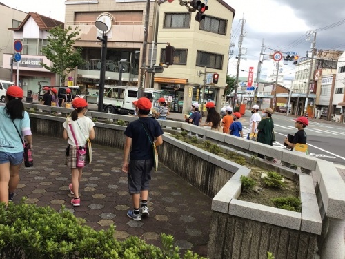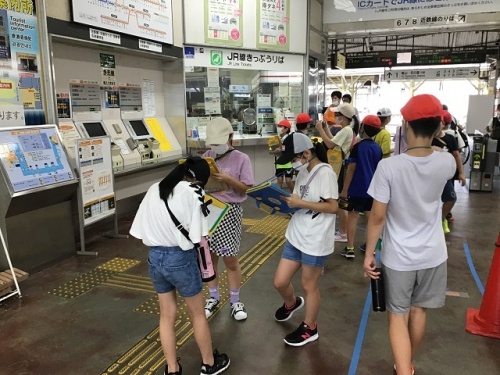 5年生が国語の「住みよい町」についての学習と総合的な学習を合わせて、教科横断的な学習を進めています。そこで、7月16日(木)に市内のバリアフリー探しを行い、その結果を基に報告書として作文にまとめるために、校外学習へ出かけました。
