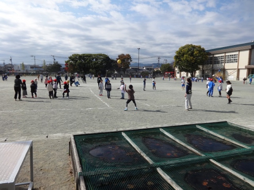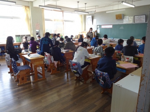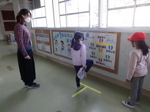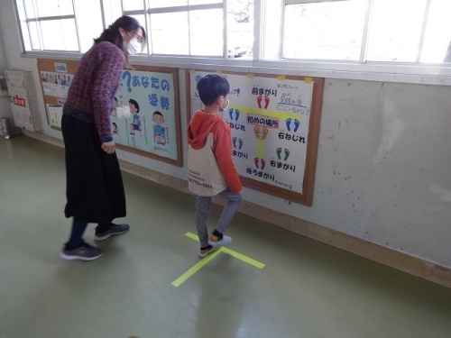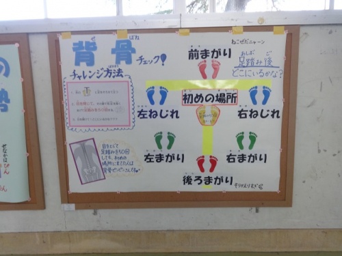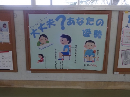 室内は寒さを感じますが、屋外はとても暖かく、20分休みには外で楽しそうに遊んでいる様子が見られました。保健室前には、姿勢を考える掲示と自分の姿勢についてチェックできる掲示がされています。その前で、自分の姿勢をチェックする子どもたちがいました。授業でも、子どもたちは落ち着いて学習を進めています。