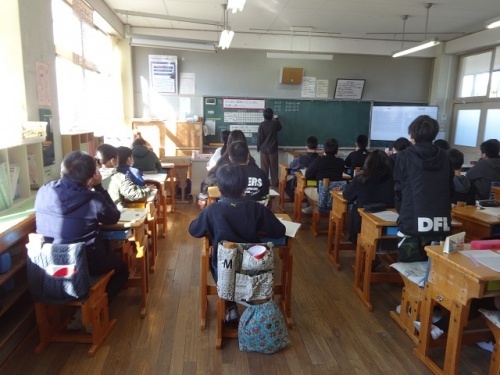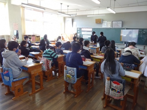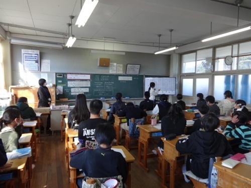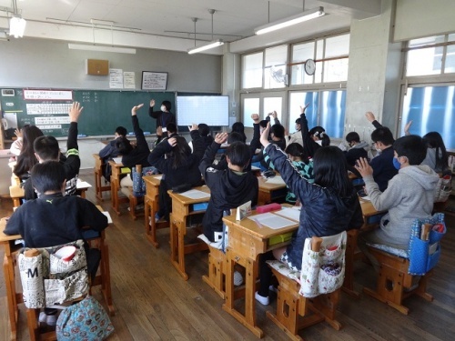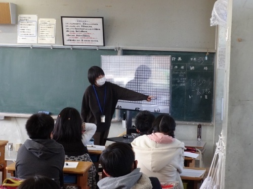 そして、反比例のグラフの特徴にはどのような特徴があるか?を考え、ノートに書き、その考えをペアで話し合いました。全体学習では、多くの子が挙手をすることができました。発表では、比例のグラフとの違いを考えました。子どもたちから「0の点を通らないこと」「曲線になり、一直線上にならんでいないこと」などが出されました。前に出て、大型モニターを使って、全体に説明することもできました。とても意欲的で落ち着いて学習ができました。