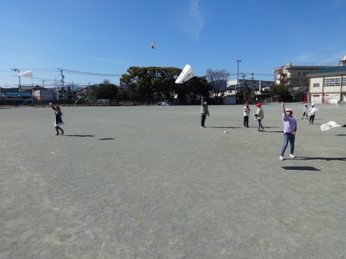 2月5日(金)3限目に1年生が「ほねなしぐにゃぐにゃだこ」を作り、たこあげを楽しみました。風にのって上がっている様子が見られました。みんなとても楽しそうでした。