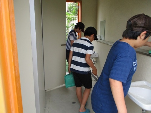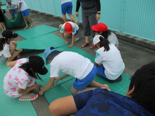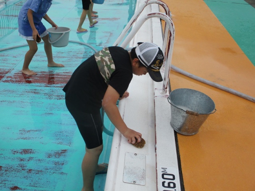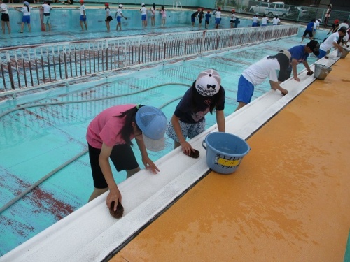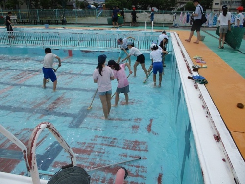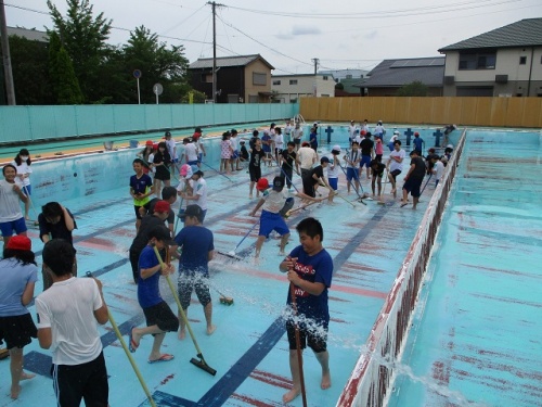 12日からのプール開きを前に、6年生がプール掃除をしてくれました。プールの底や壁をこするグループ、マットを敷くグループやプール周辺を掃除するグループに分かれ、時間いっぱい使ってきれいにしてくれました。最後は、暑い位の陽気でしたので、水浴びをして楽しんでいました。6年生にとり最初で最後のプール掃除でした。がんばってくれました。新聞社が取材にみえていました。