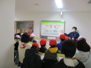最初にクリーンセンターについての説明をビデオで見せていただいたあと、クラスごとにいろいろな場所を見学させていただきました。たくさんのゴミが集められているところや、分別の様子など、係の方に案内していただきながら、詳しく知ることができました。