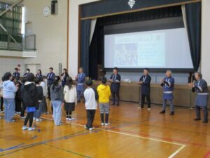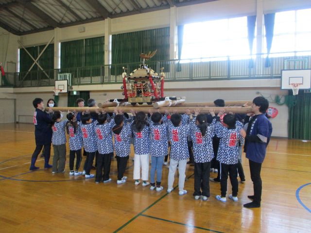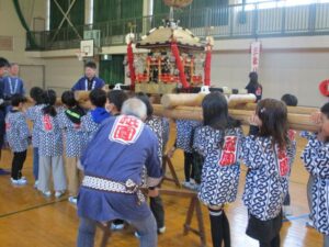 2月19日(木)に、松阪祇園まつり三社みこし世話人会の方々に来ていただき、4年生が三社みこしについて学習をしました。はじめに祇園まつりや三社みこしの由来について、詳しくお話を聞き、クイズも出していただいて、楽しく学ぶことができました。そしていよいよみこしをかつぐ体験です。チョーサヤのかけ声の練習をしたあとで、4つのグループに分かれて、みこしをかつがせていただきました。はっぴも着せていただき、まつりの雰囲気満点です。予想より重かったようですが、大きなかけ声とともに、最後まで頑張ってかつぐことができました。来年の祇園まつりに参加してくれる子が増えそうです。